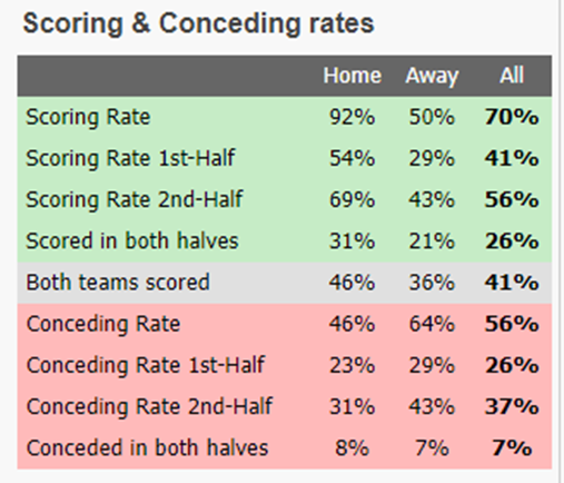 At the moment, our scoring rate is higher than our conceding rate, its currently 70% scoring rate to 56% conceding rate, this is something we can look at as a positive, essentially, we are scoring more than we conceded, definitely a plus, but the conceding percentage has increased recently, a stat to keep an eye on and with the return of players from injury, hopefully something we can improve on.